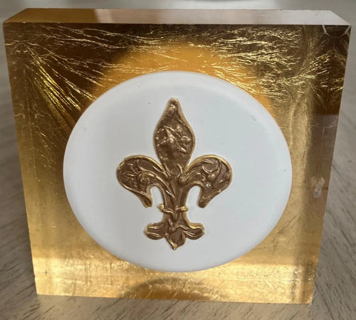 Fluer De Lis Intaglio Acrylic Block | 4x4x1 Gold Background | Elegant French Decor | Desk or Shelf Accent | Gift for Home